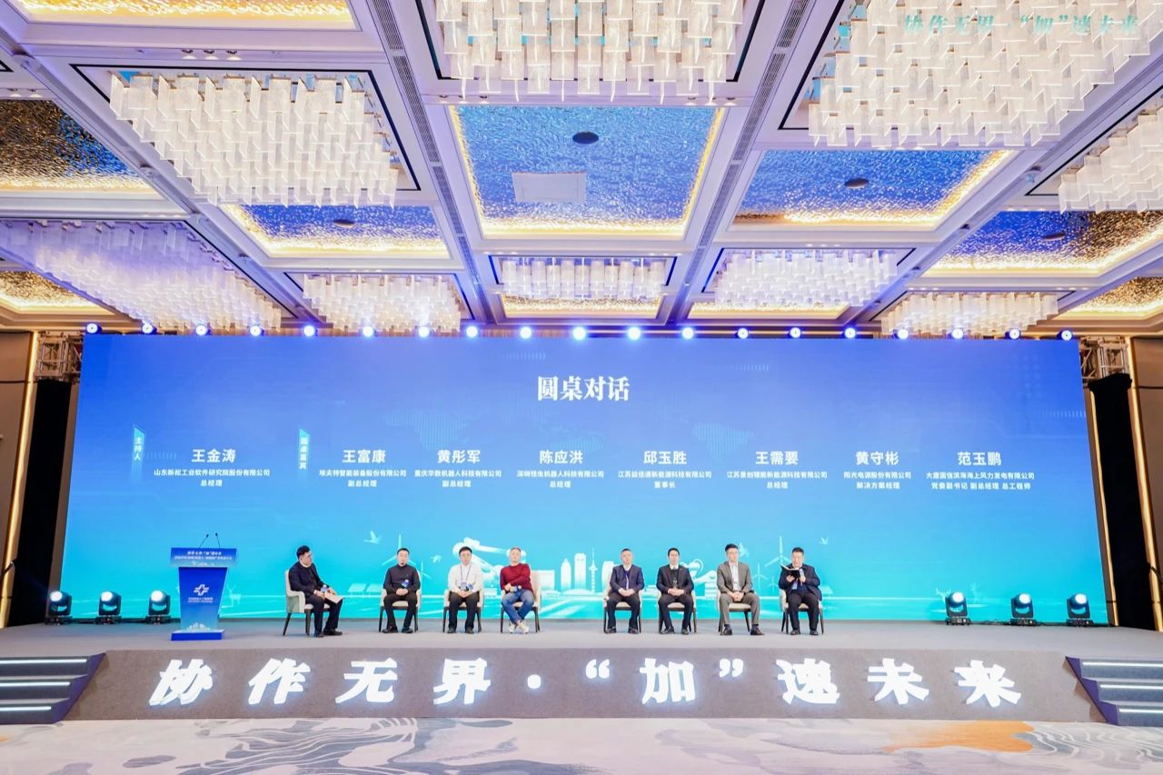 埃夫特智能装备股份有限公司副总经理王富康、重庆华数机器人科技有限公司副总经理黄彤军、深圳怪虫机器人科技有限公司总经理陈应洪、江苏益佳通新能源科技有限公司董事长邱玉胜、江苏景创锂能新能源科技有限公司总经理王需要、阳光电源股份有限公司解决方案经理黄守彬、大唐国信滨海海上风力发电有限公司党委副书记副总经理总工程师范玉鹏共同参与,并就新能源行业未来走向,机器人解决方案现状、合作现状、升级创新方向、合作路径等议题同台共话。本次对话由山东新松工业软件z6.com尊龙股份有限公司总经理王金涛主持。