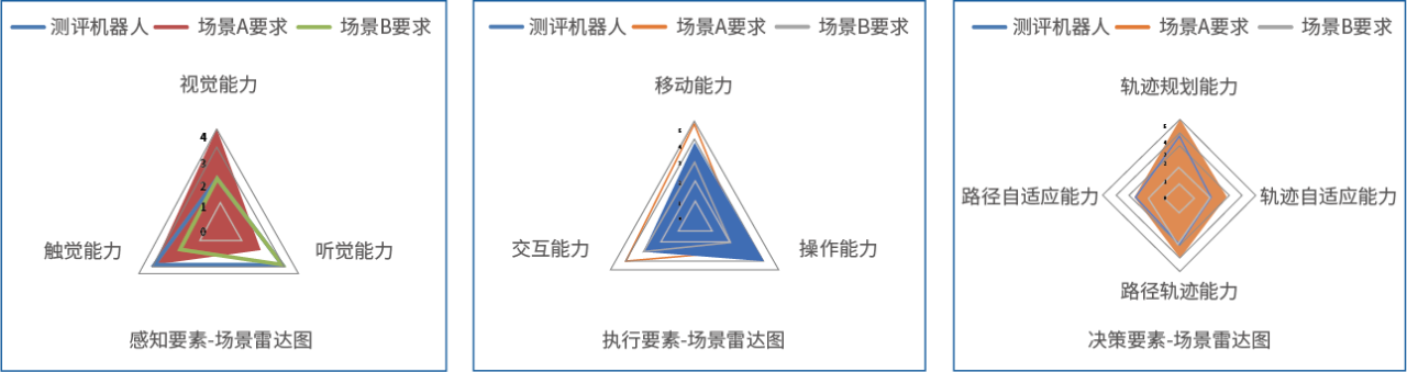 机器人智能化水平评价,从机器人智能化的感知、认知决策、执行各要素出发,结合不同场景下的智能化水平的要求,形成智能化各要素在对应场景下的能力要求。当测评机器人各能力要素均超过对应场景的能力要求时,即认为该测评机器人符合该场景的智能化要求。