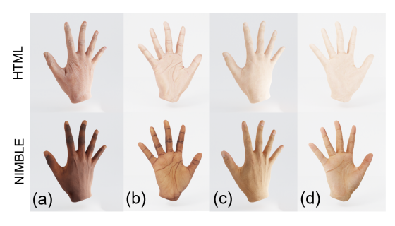 (a)(b)分别是两个模型数据集中的手部纹理贴图,(c)(d)是在两个模型的贴图空间中随机采样的纹理。显然该研究的模型能够保留更多细节,并且法线贴图进一步实现了手背上肌腱凸起的效果。