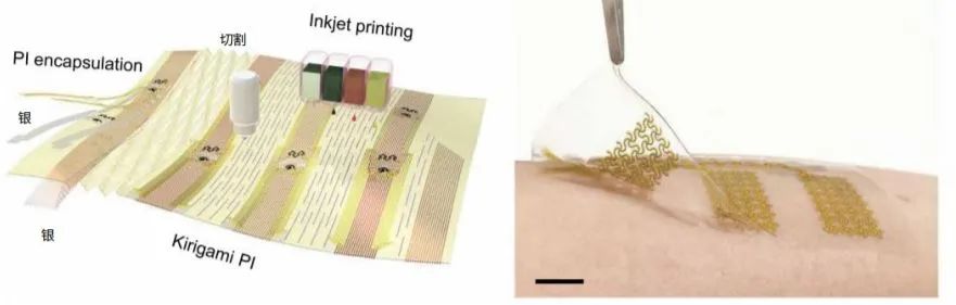 在e-skin-R中,嵌入在水凝胶中的是传感器通过喷墨打印在皮肤上,就像喷墨打印机将文本打印到一张纸上一样,这里可不是普通的墨水,而是团队自开发的多种纳米材料墨水,可以低成本的将多种纳米材料等修饰在柔性基底上,并构建相应物理及化学传感器。