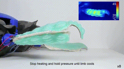 可变形的四肢是最重要的部分,由可变刚度材料和气动驱动器组成,这种可变刚度材料可以通过加热软化,并给气动推杆充气,使肢体的横截面积和硬度发生变化。