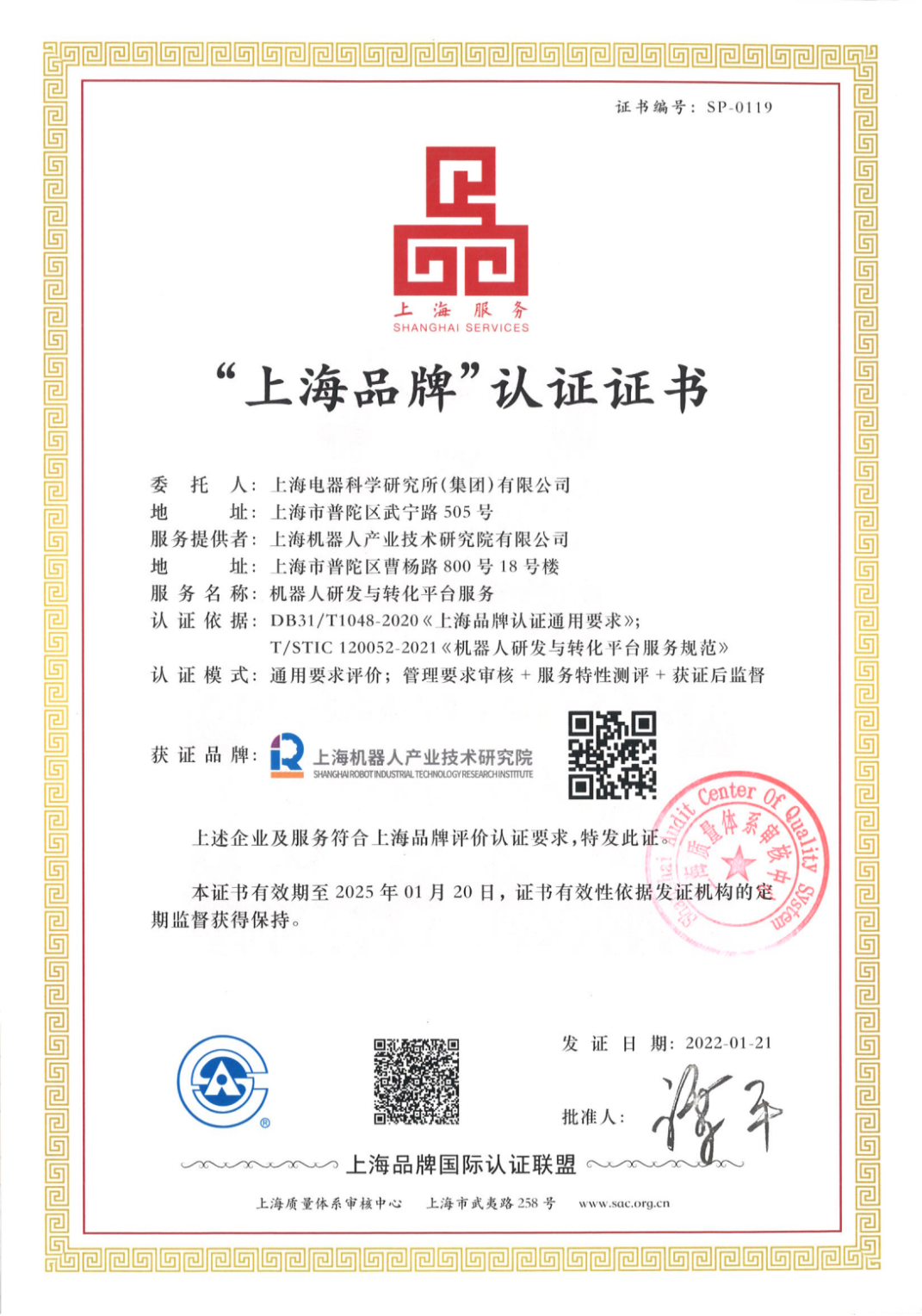 我院企业标准Q/SRI 001-2021《机器人研发与转化平台服务规范》喜获”上海标准“称号。