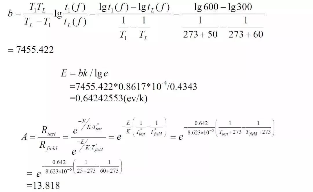 但是我们在做产品温度加速时,一般是针对整系统,那么Ea应该如何选取。通常情况下,根据经验Ea可选取0.5~0.7eV.比如戴尔电脑对PC的Ea选取0.6eV,这个值也是多次试验的出来的平均值。这个Ea选取主要针对但应力加速时,如果有2个应力以上,则无需考虑,可以通过试验结果计算出来。
