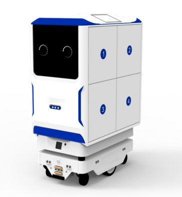 药品/补液运输机器人外观尺寸为810x480x1245mm(长*宽*高),单个药柜容量为55L,整体载重150Kg,最高运行速度为1.8m/s。 主要用于中心药房到各病区的口服药物及Pivas运输、病区到检验科的标本运输。